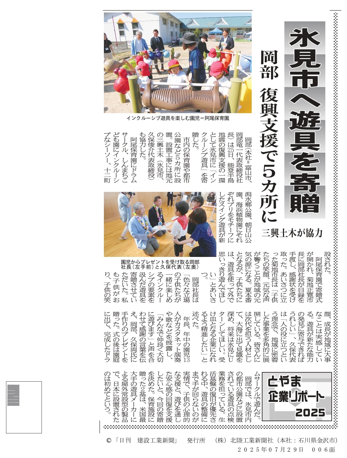 氷見市へ遊具寄贈、復興支援の取り組みがメディアで紹介されました